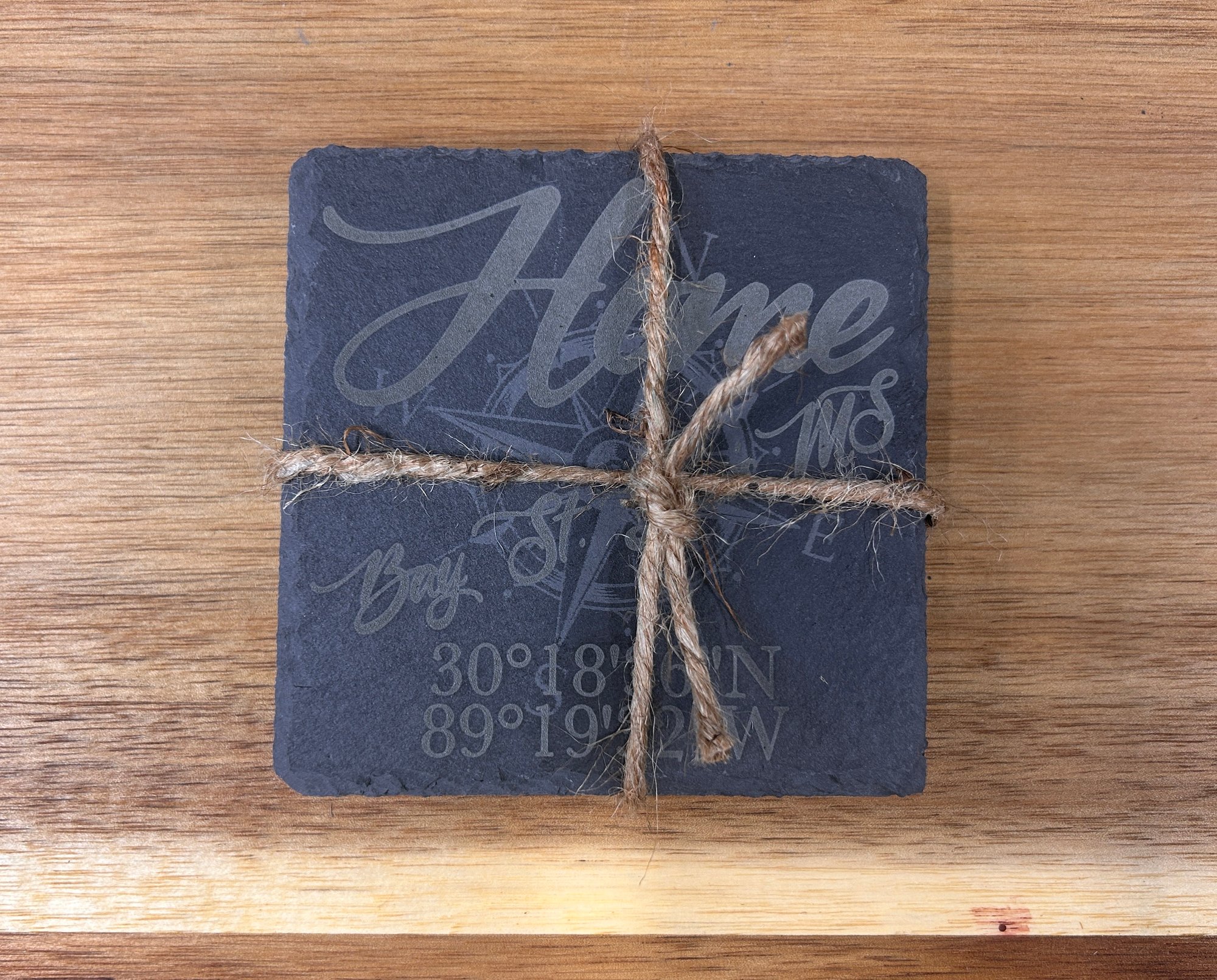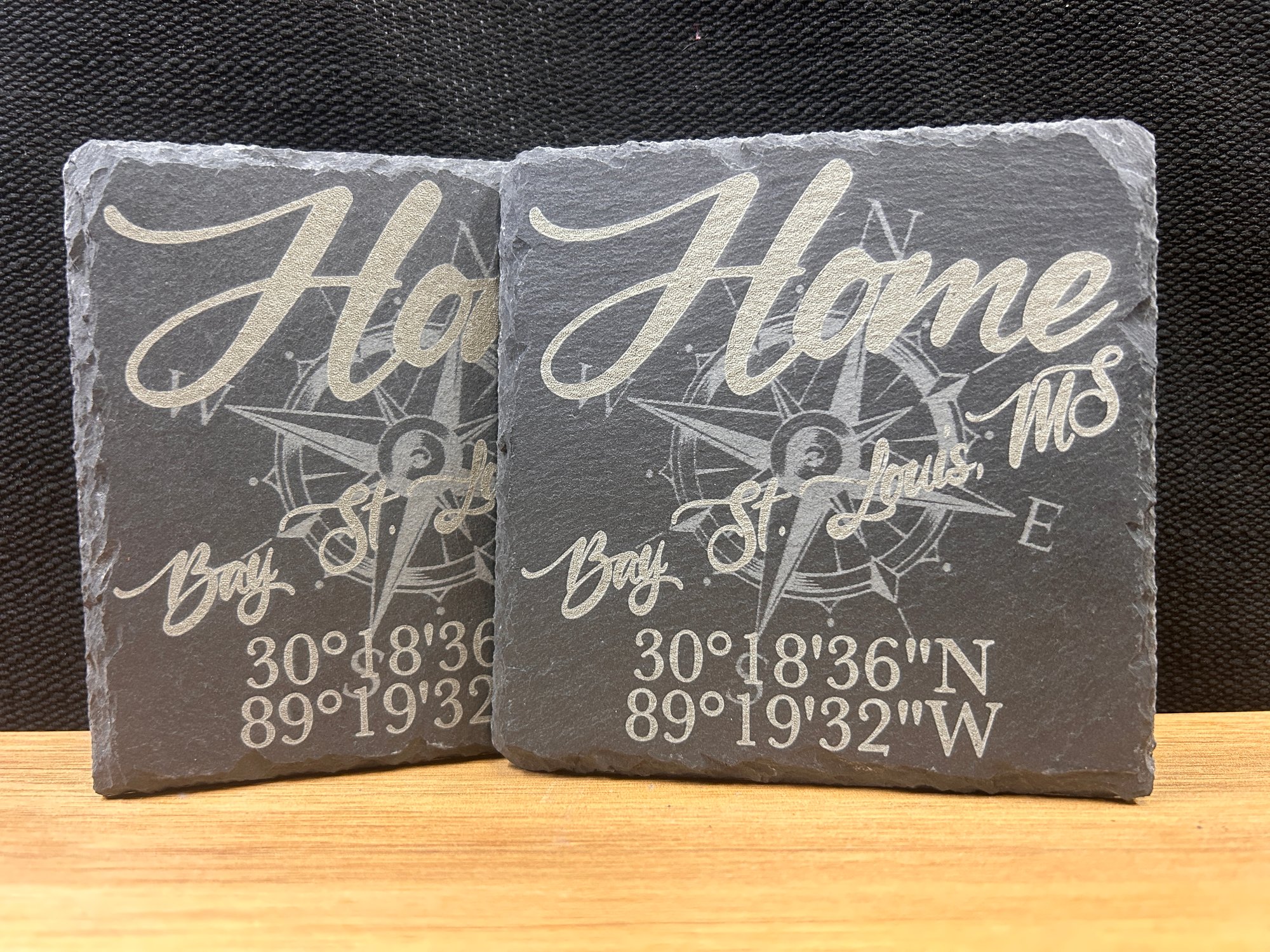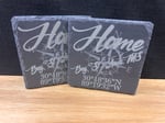 Set of 4 laser etched. Customized to your "Home/City/GPS" themed. 4" x 4" slate coasters. These are made to order, imperfections may exist. Free shipping.
