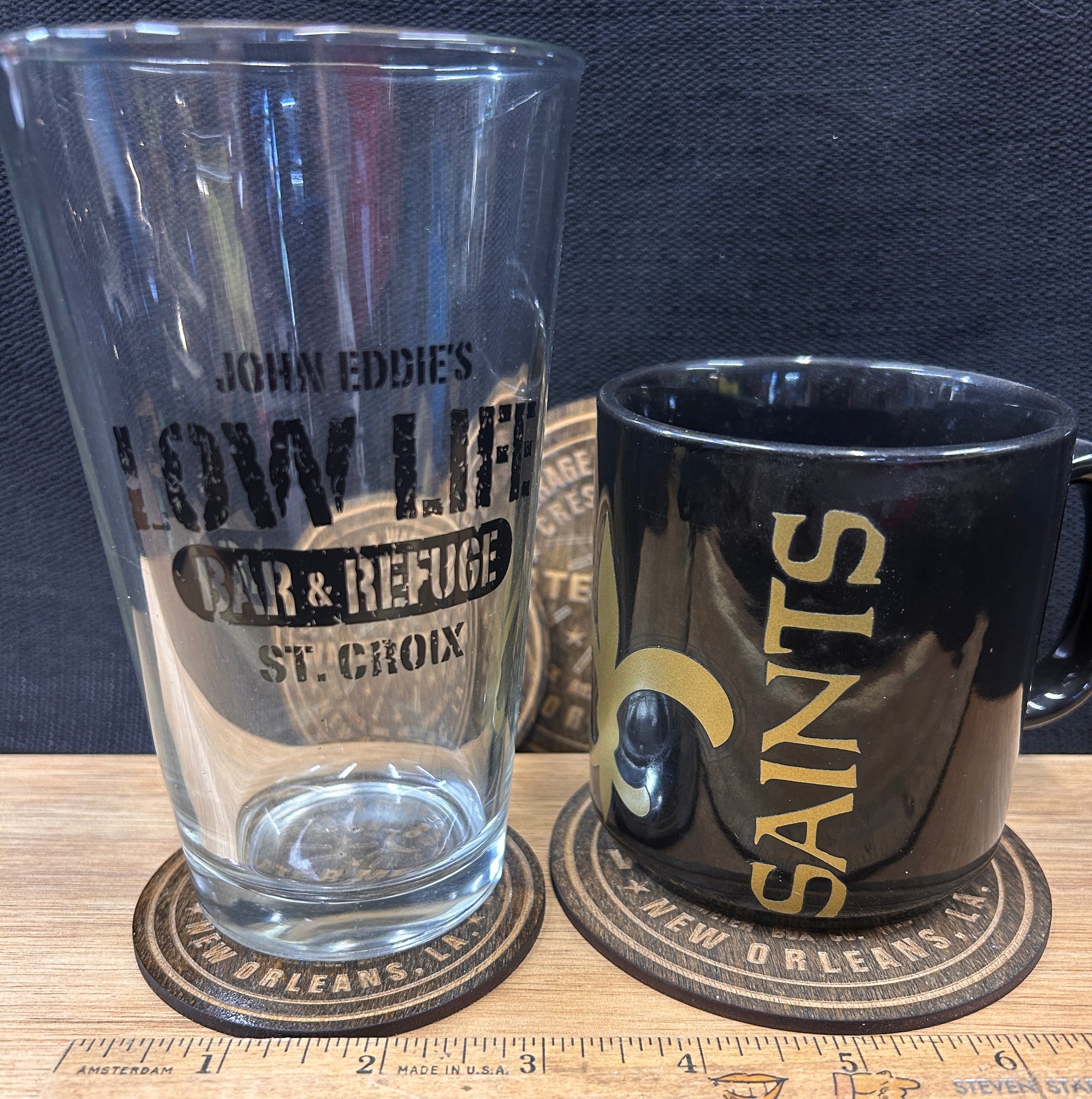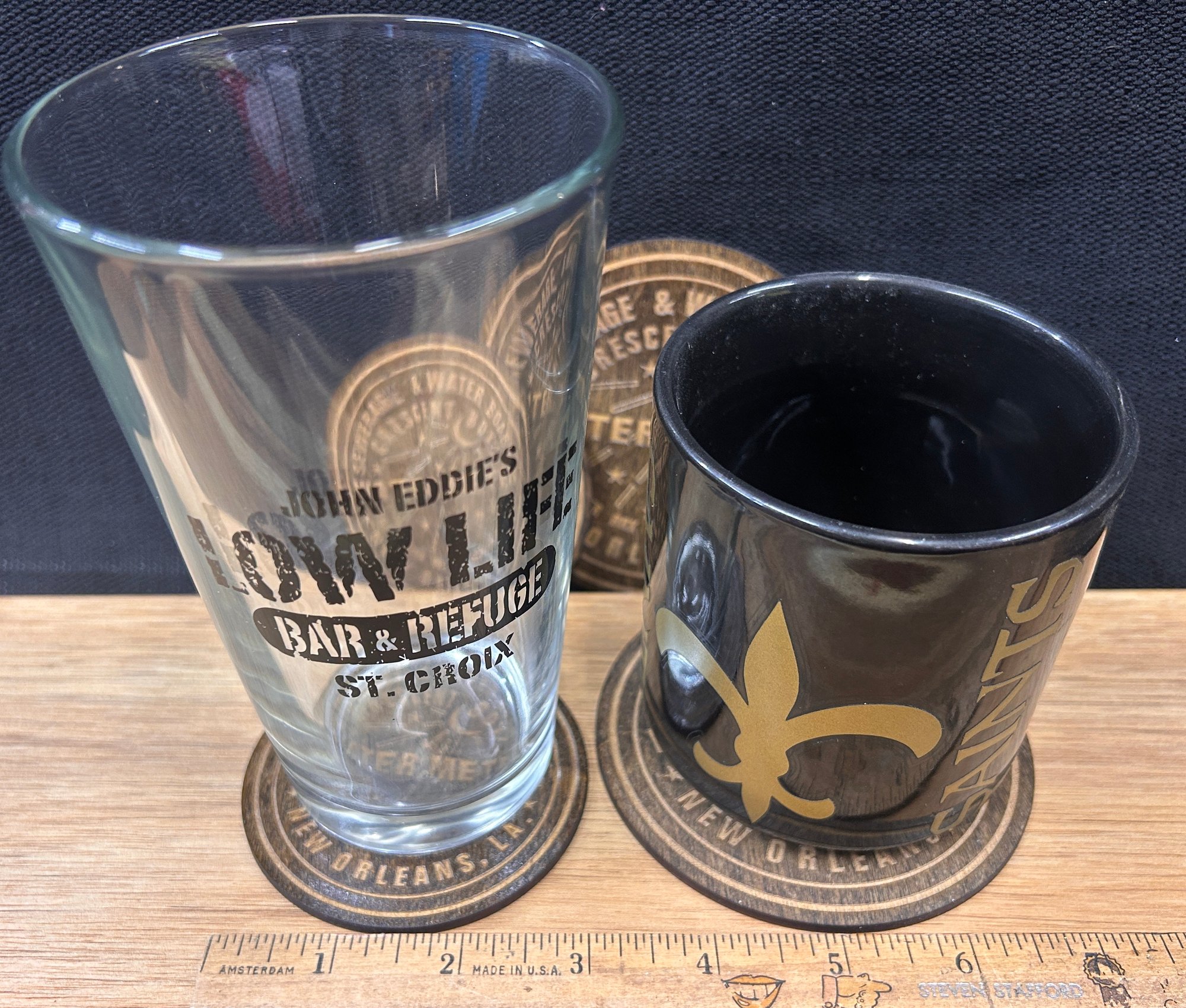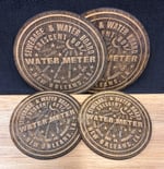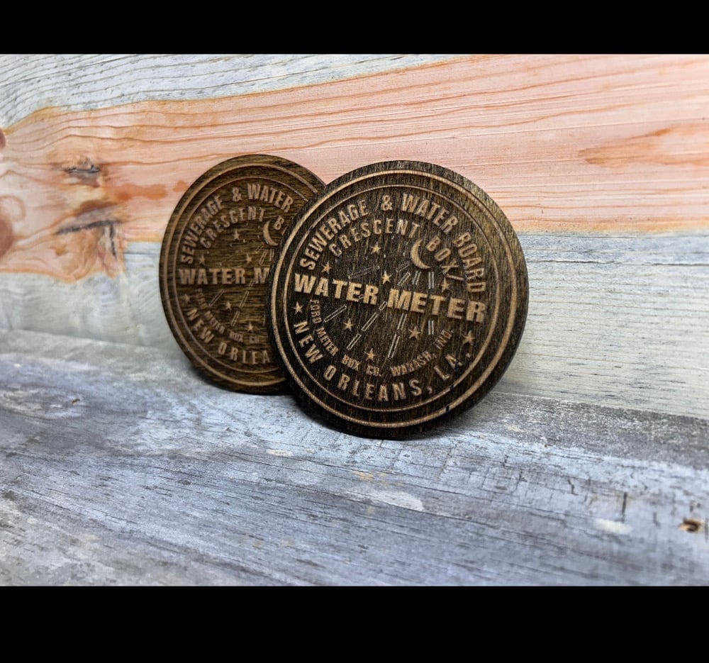 New Orleans' infamous Watermeter design. These are stained and laser etched and cut on 1/8" Baltic Birch then clear coated for added protection. Choose your size: 4" or 3" round. Priced is for a set of two (2). Free Shipping.